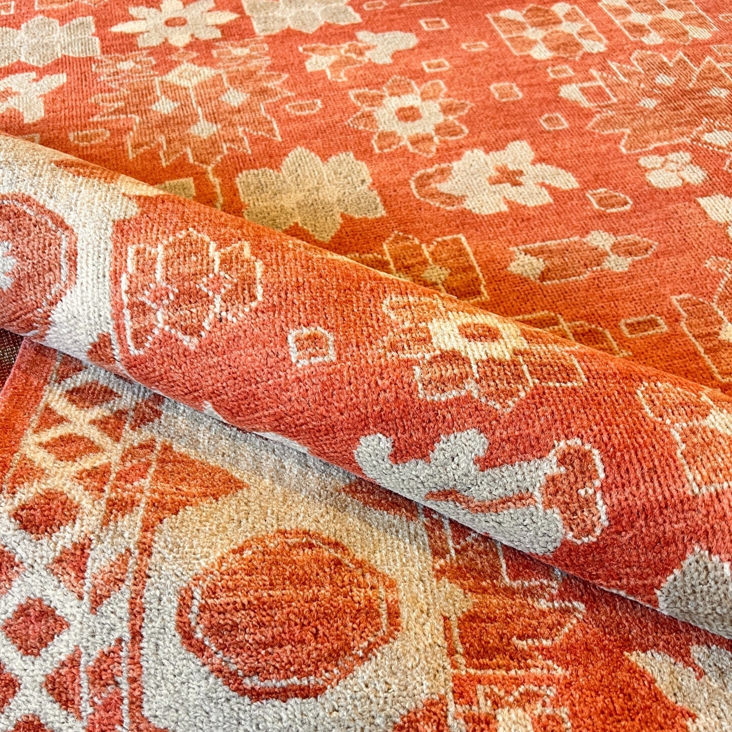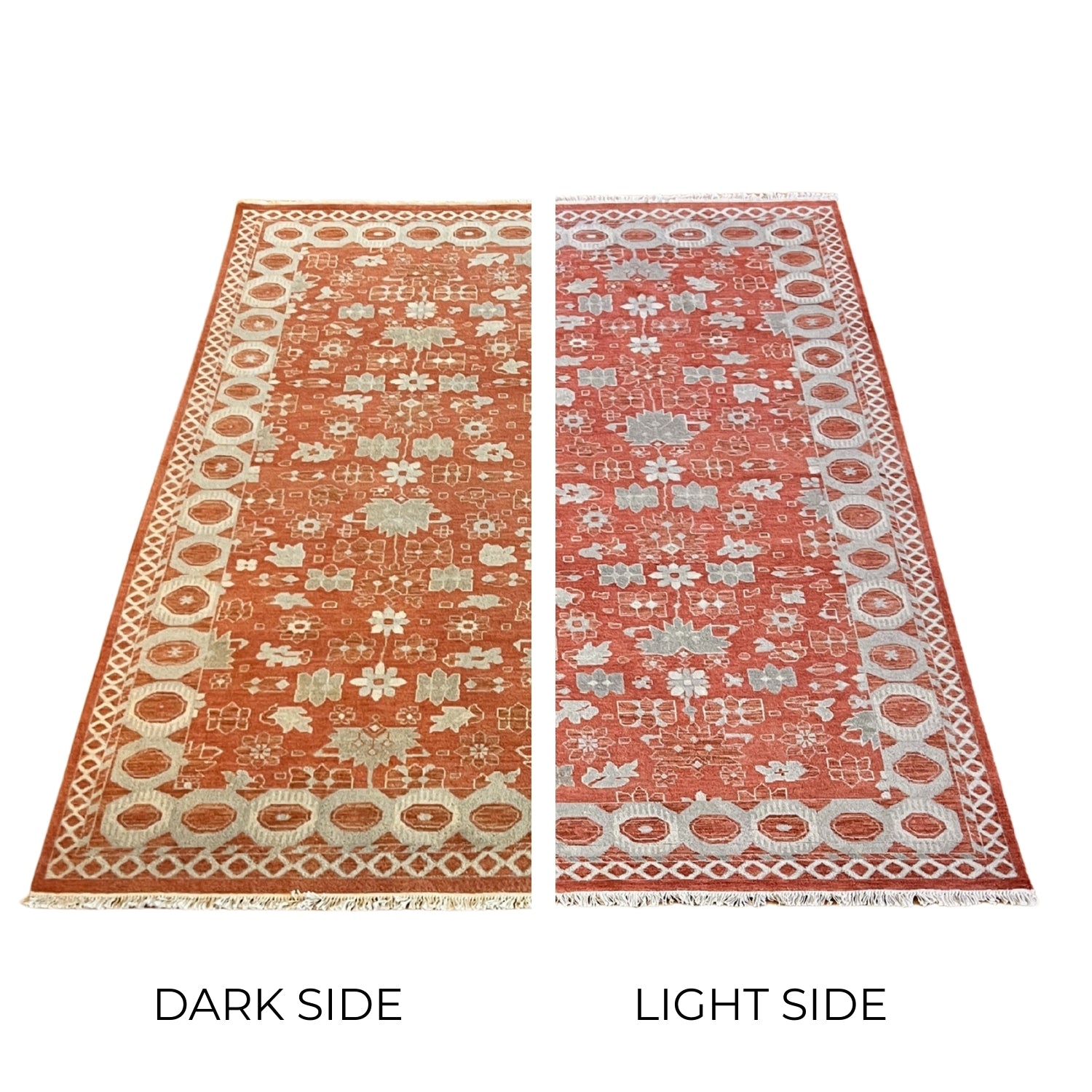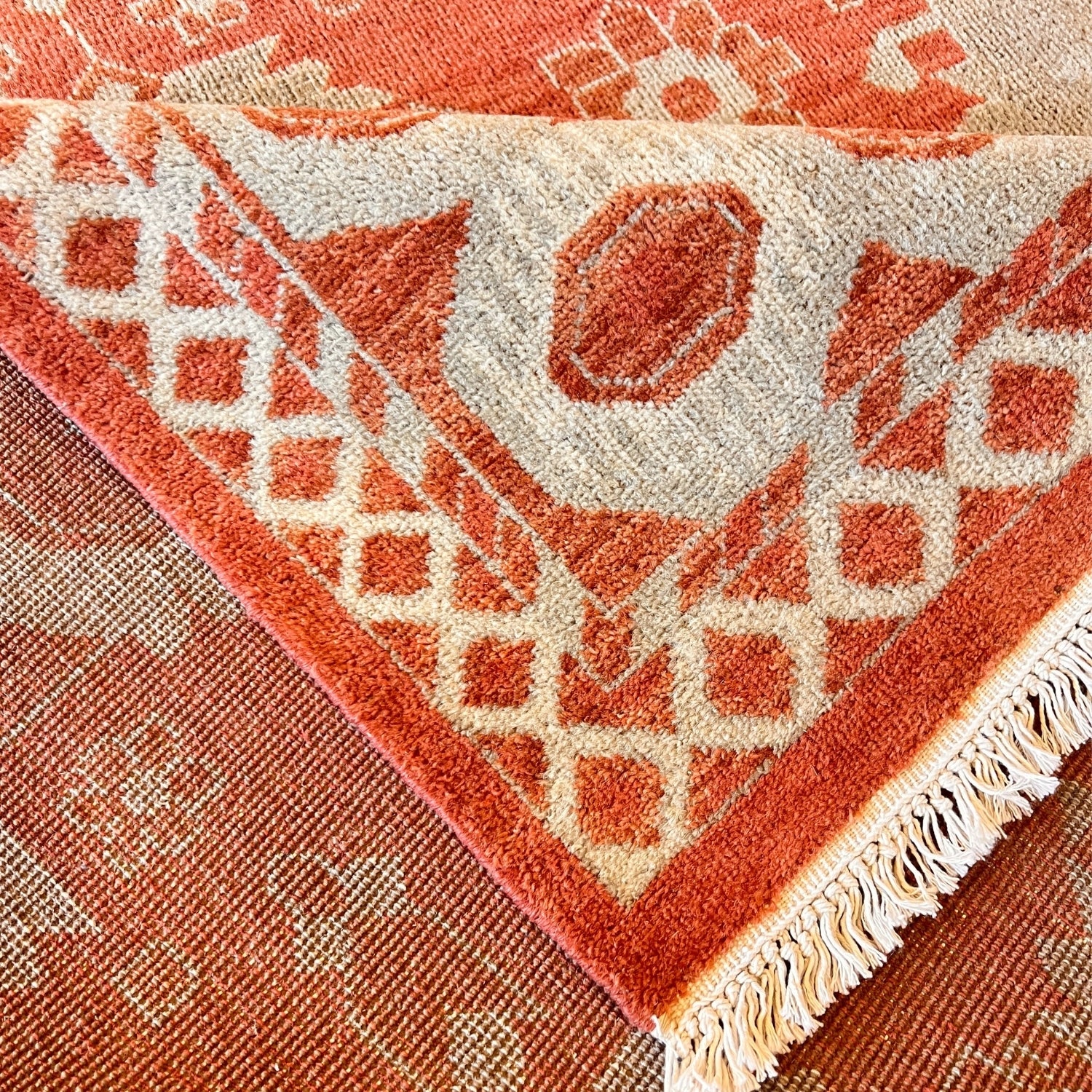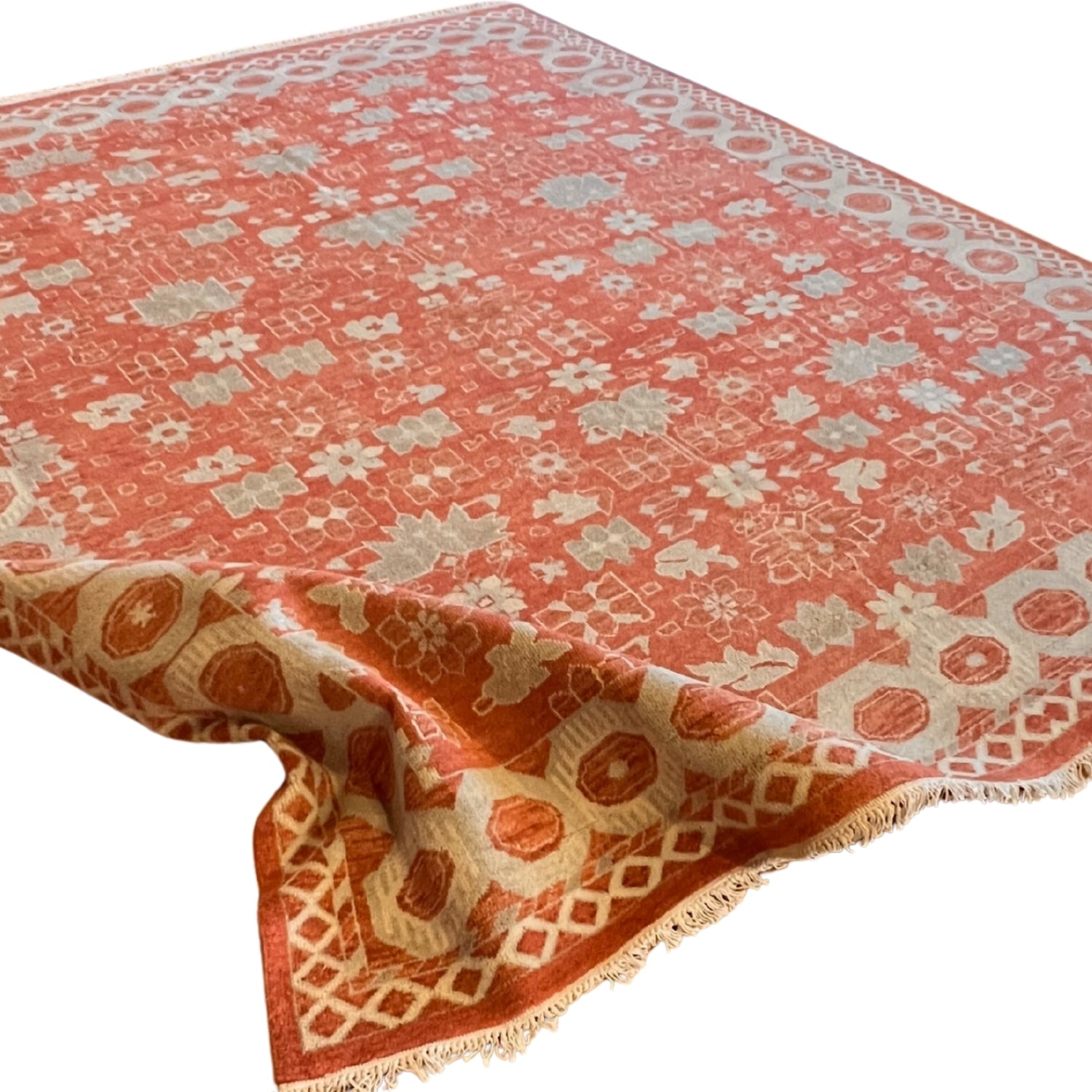 Hand-knotted in India Expertly hand-knotted by artisans in India, crafted from durable, plush wool with a vintage texture in soft weathered colors and finished with a classic fringe. Available in up to seven sizes: 12'0 x 15'0, 10'0 x 14'0, 11'0 x 11'0, 9'0 x 12'6, 7'9 x 9'9, 5'0 x 7'0, 2'10" x 12'0."