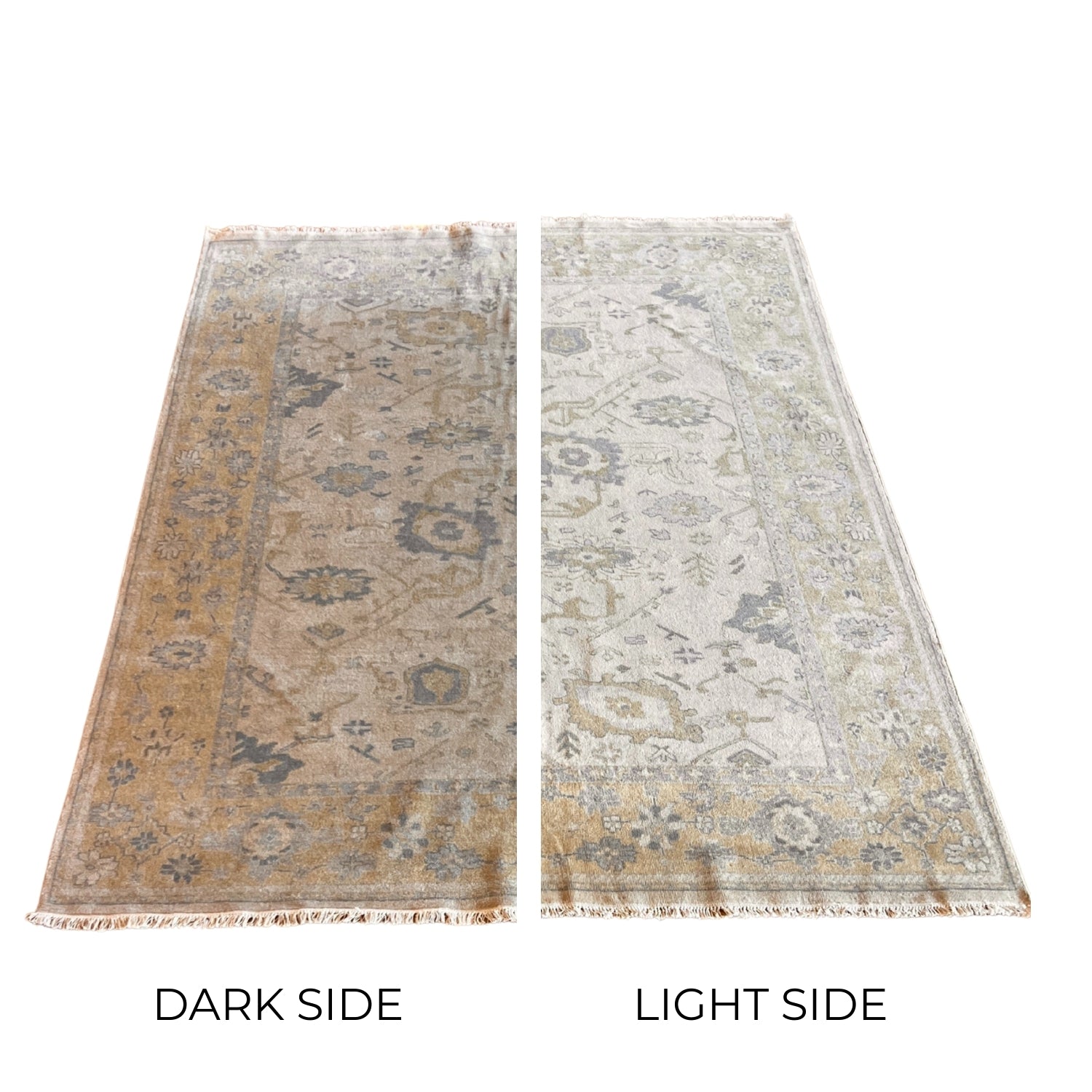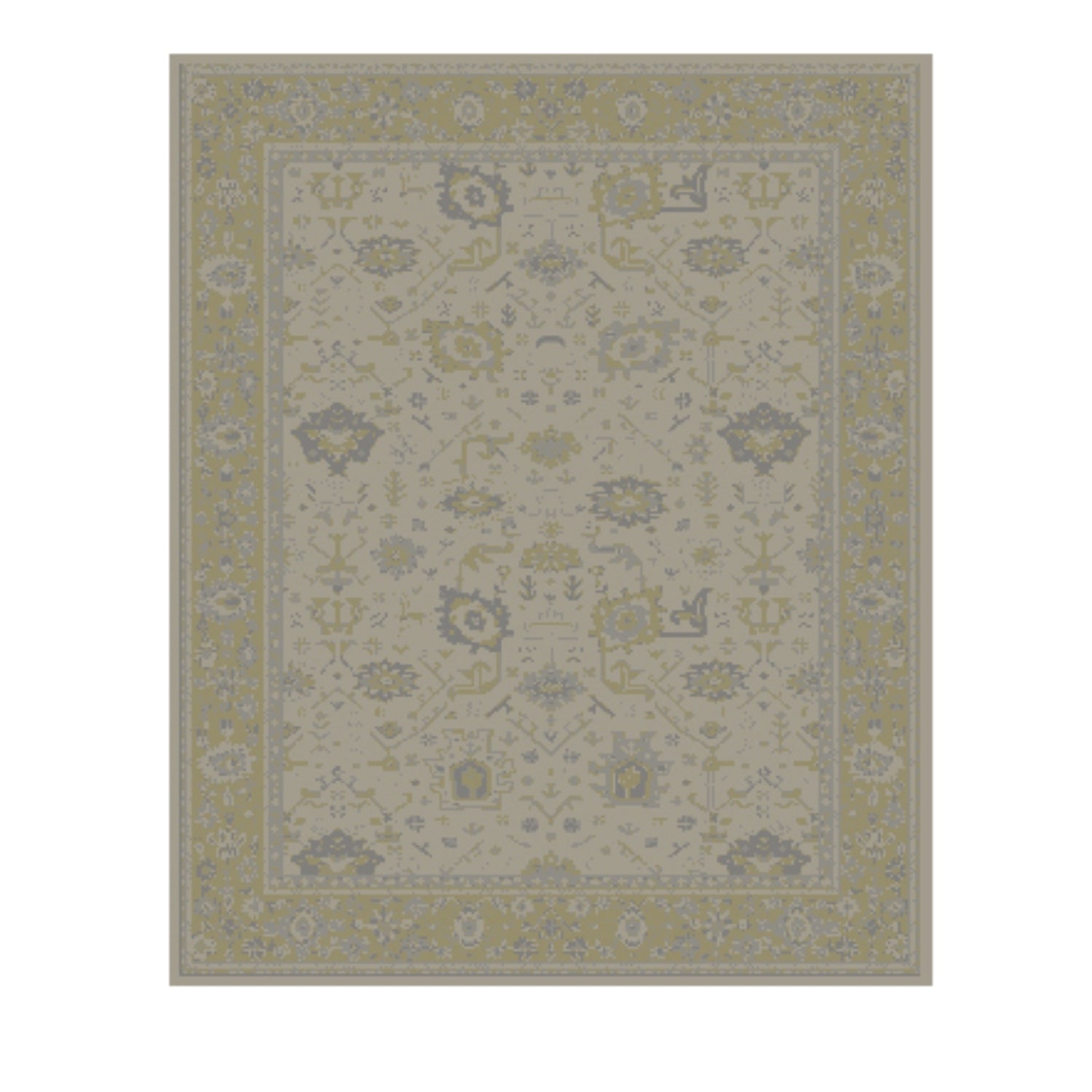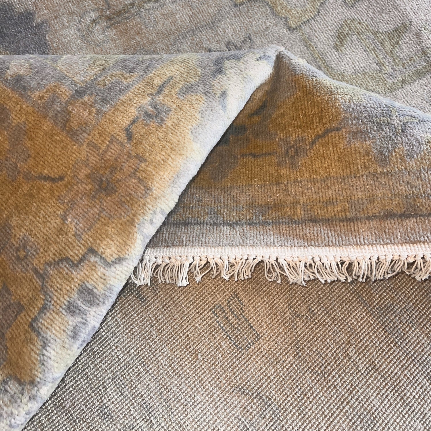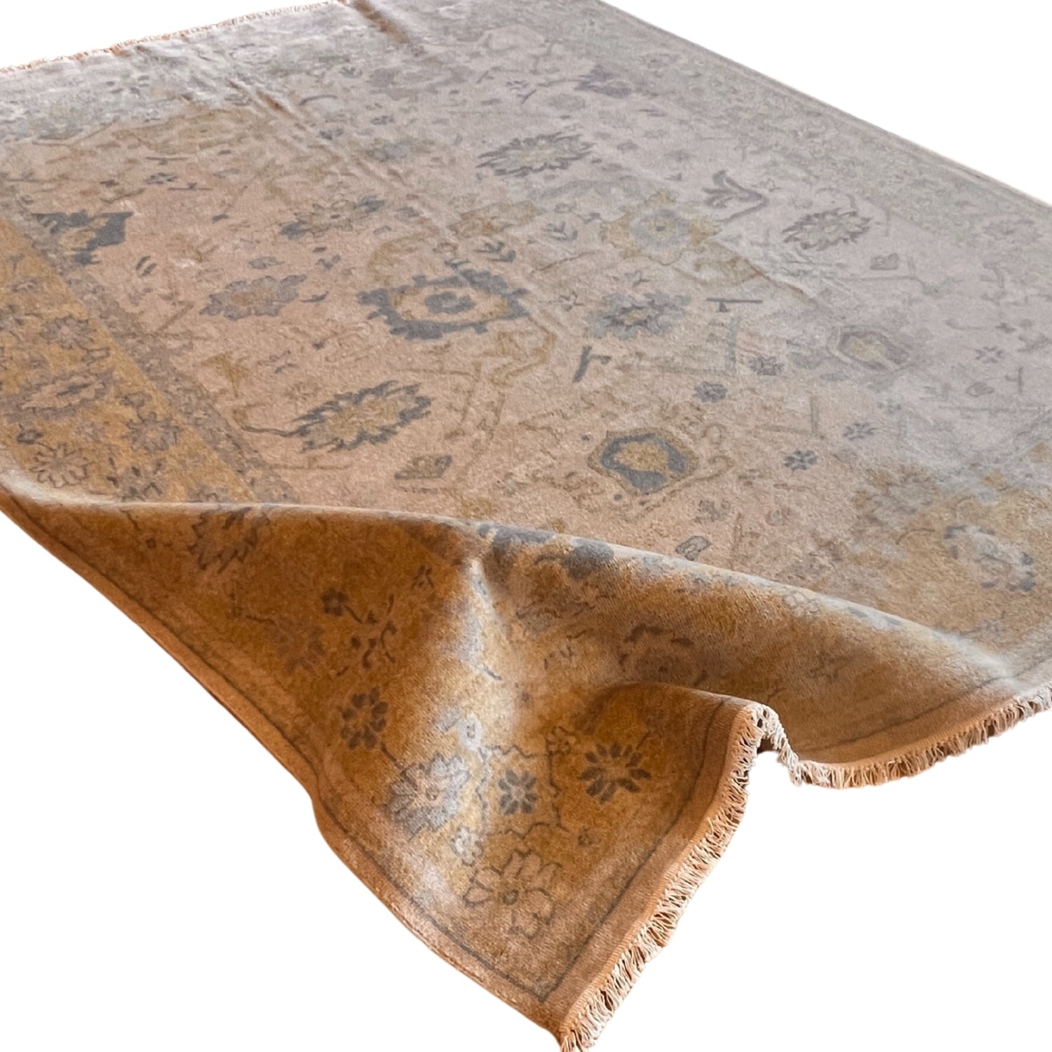 The Anatolia showcases a balanced Oushak design, rendered in serene shades of muted gold and blue. Hand-knotted in India from durable wool, this piece features a distinct vintage texture and is finished with a classic fringe. It offers a timeless, weathered look that perfectly suits both traditional and modern interiors.