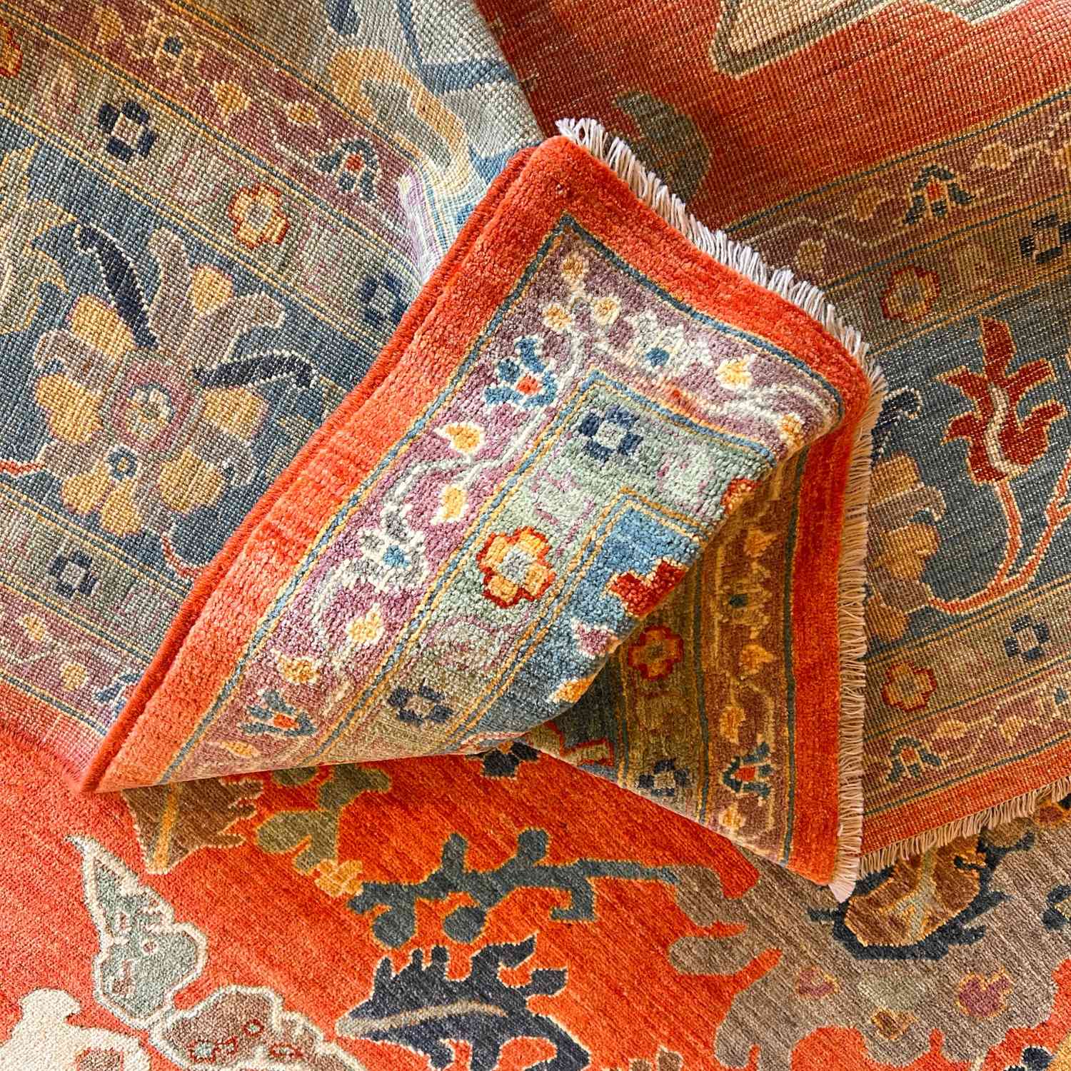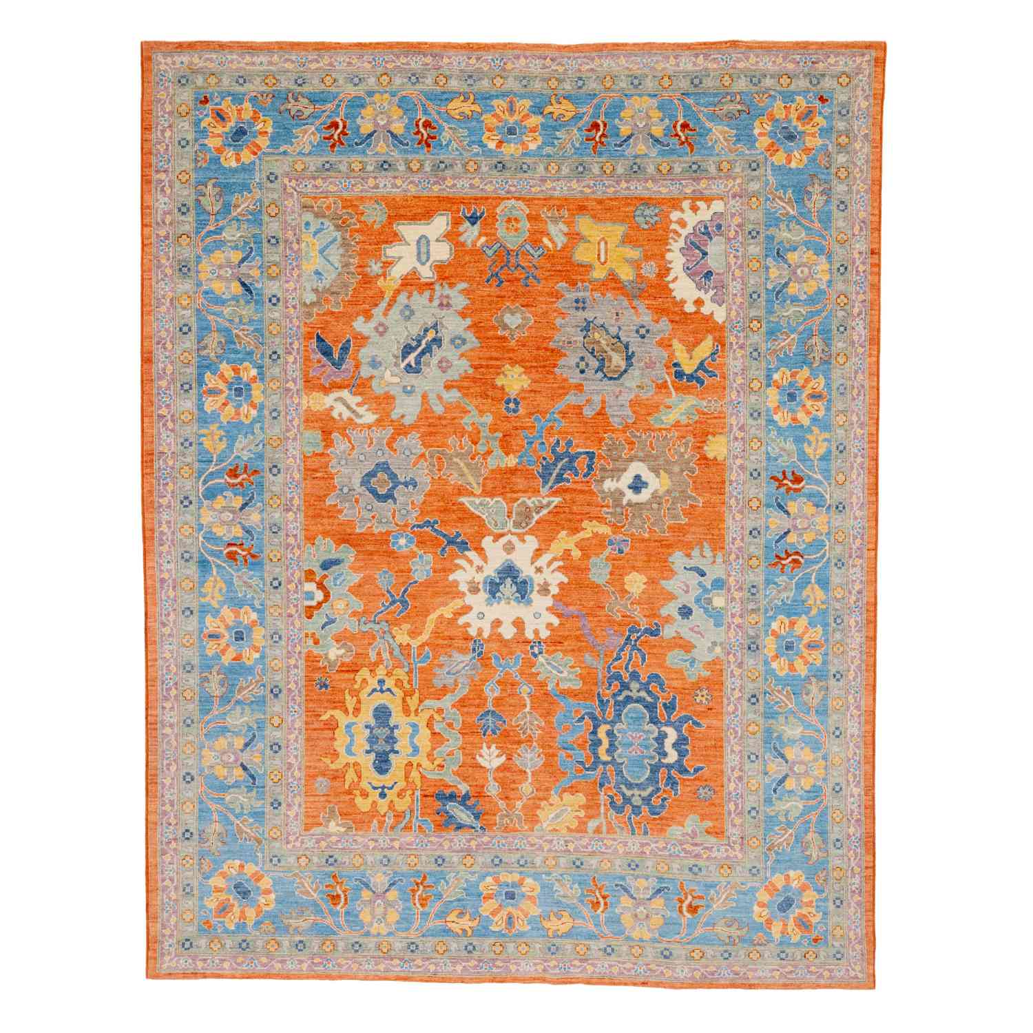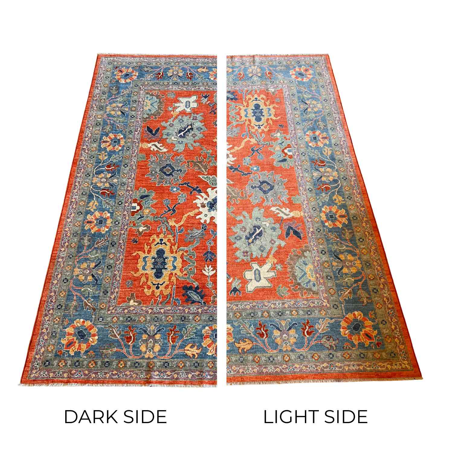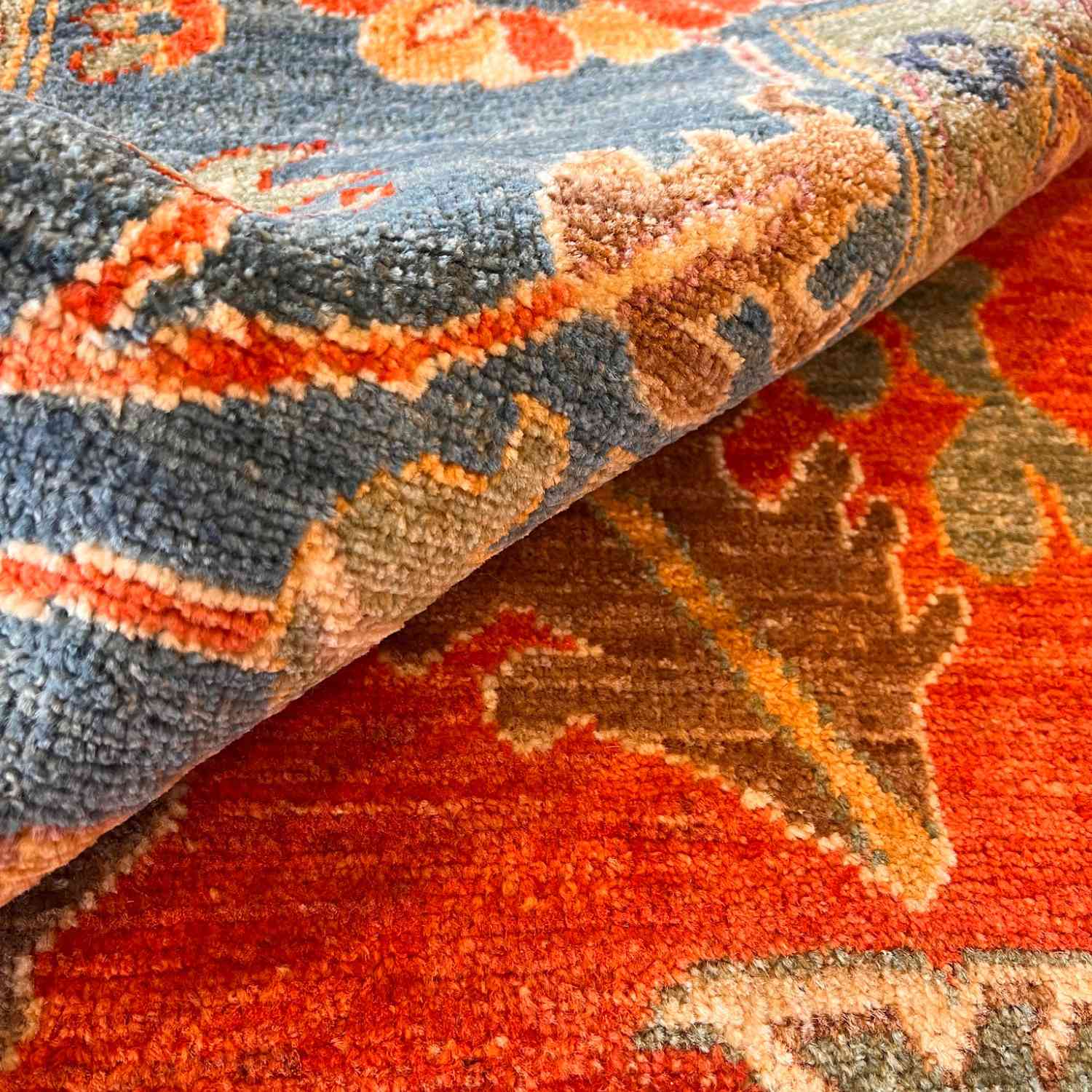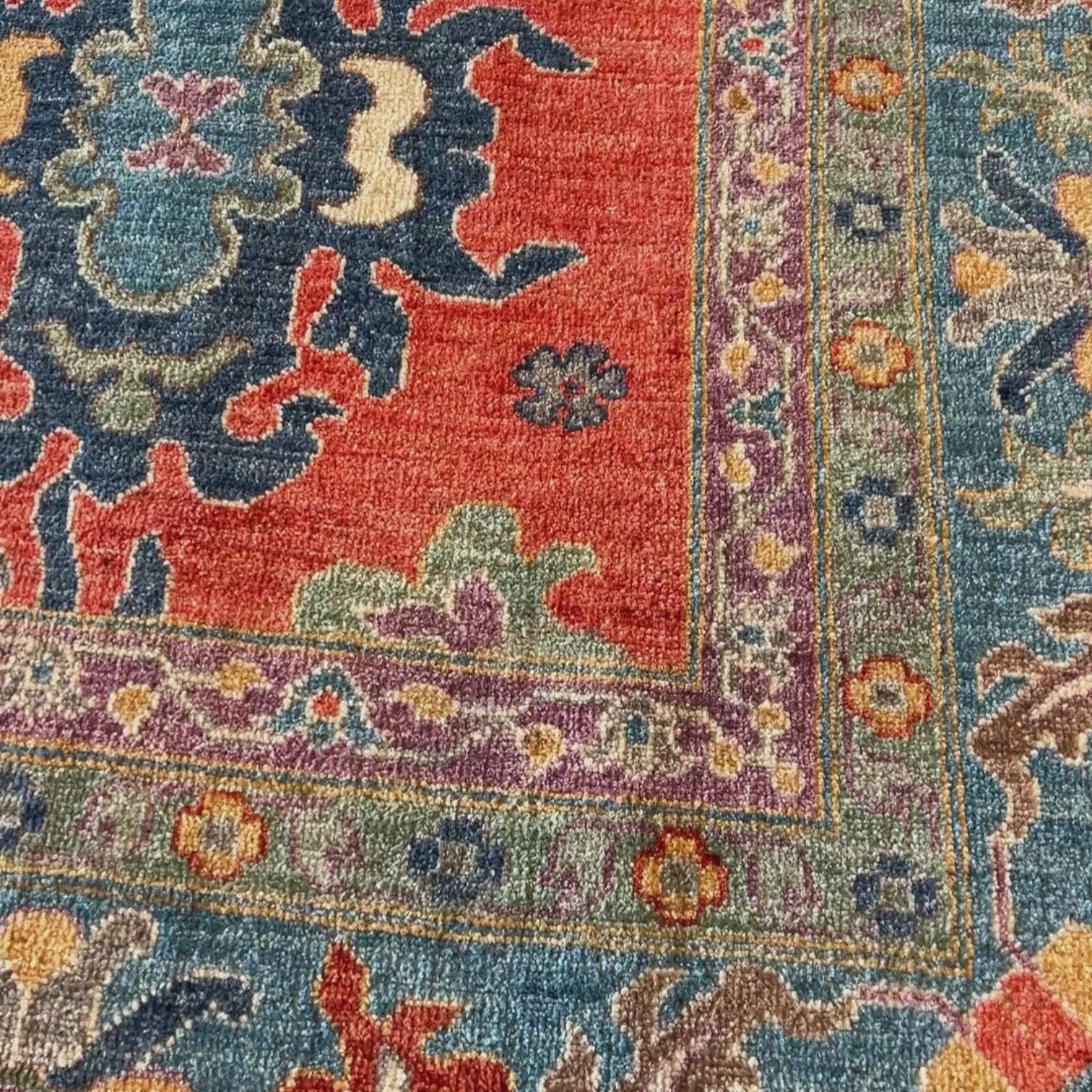 Hand Knotted Wool Rug - Modern Red with Blue Border This elegant hand knotted wool rug features a sophisticated shade of red with a striking bright blue border, crafted in an updated modern design. Expertly made in Afghanistan, this premium wool rug combines traditional craftsmanship with contemporary style to create a stunning focal point for any room.