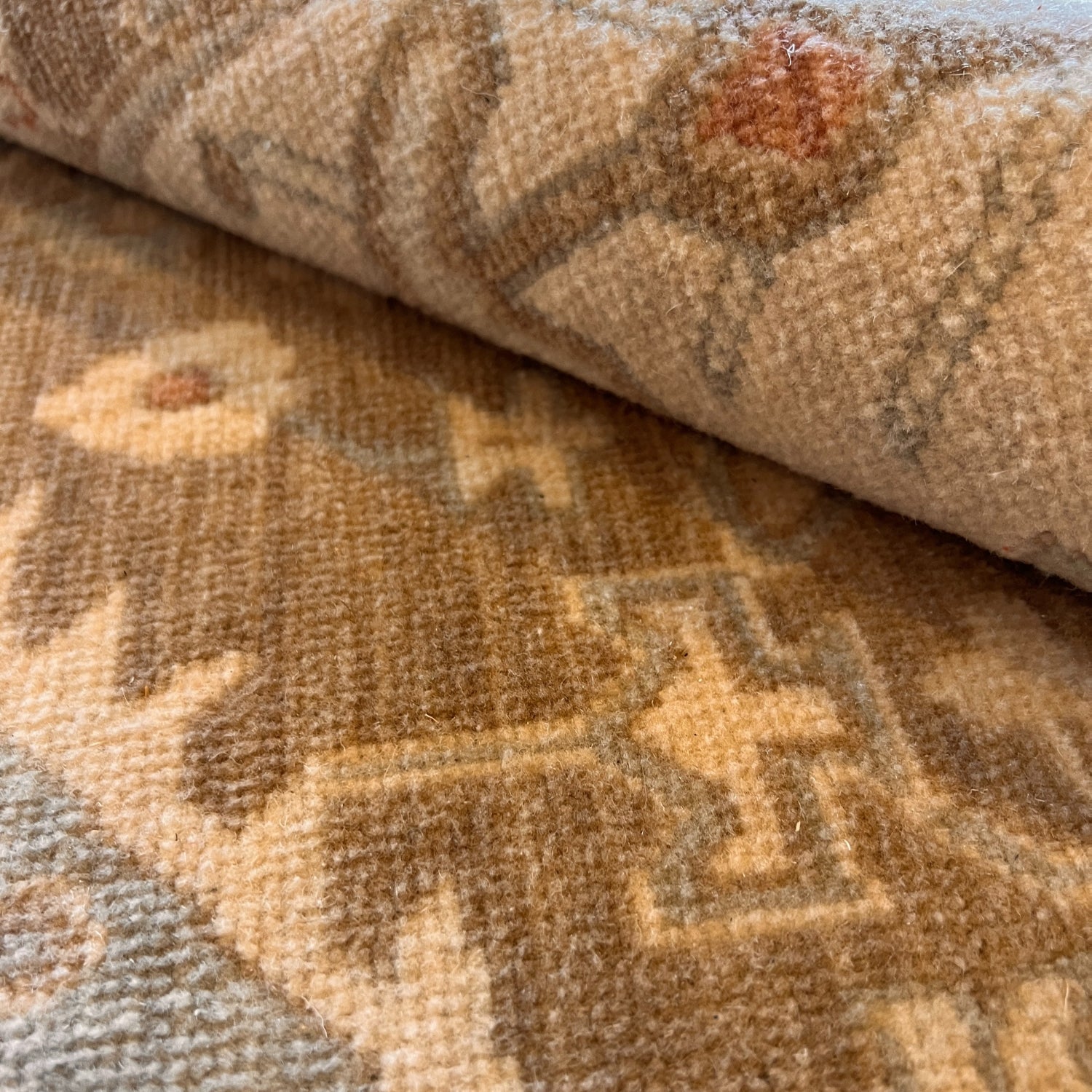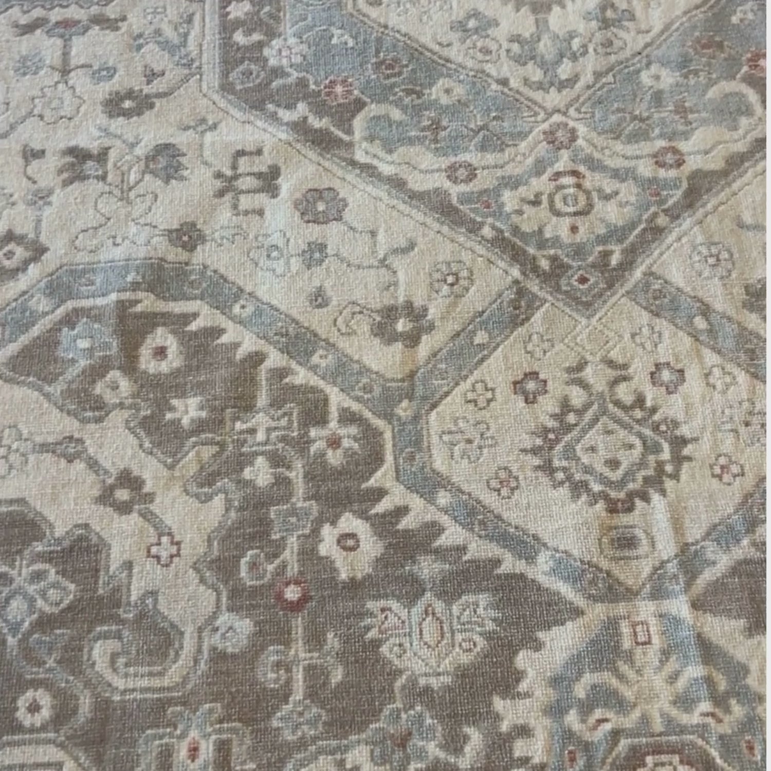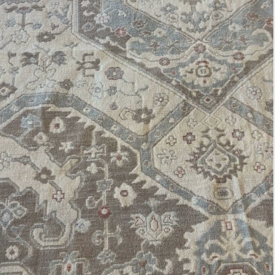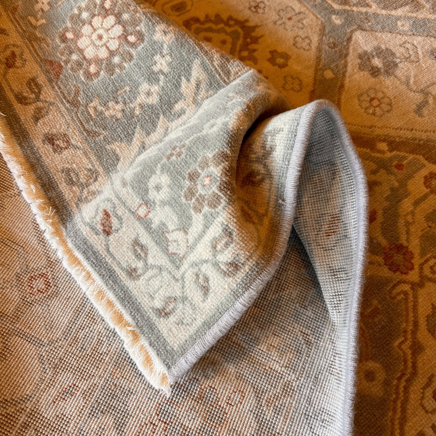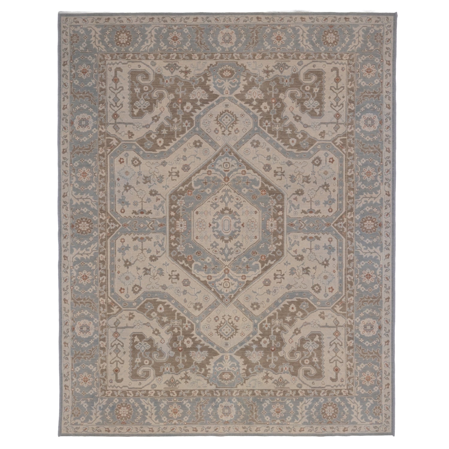 The Ashley rug anchors your space with a bold medallion and classic corner design in a fashionable palette of ivory, steel blue, and deep mocha. This fine wool rug is luster-washed for an antique look and finished with a distinctive fringe. Available in four sizes: 5' x 8', 8' x 10', 9' x 12', and 9’10" x 13'.