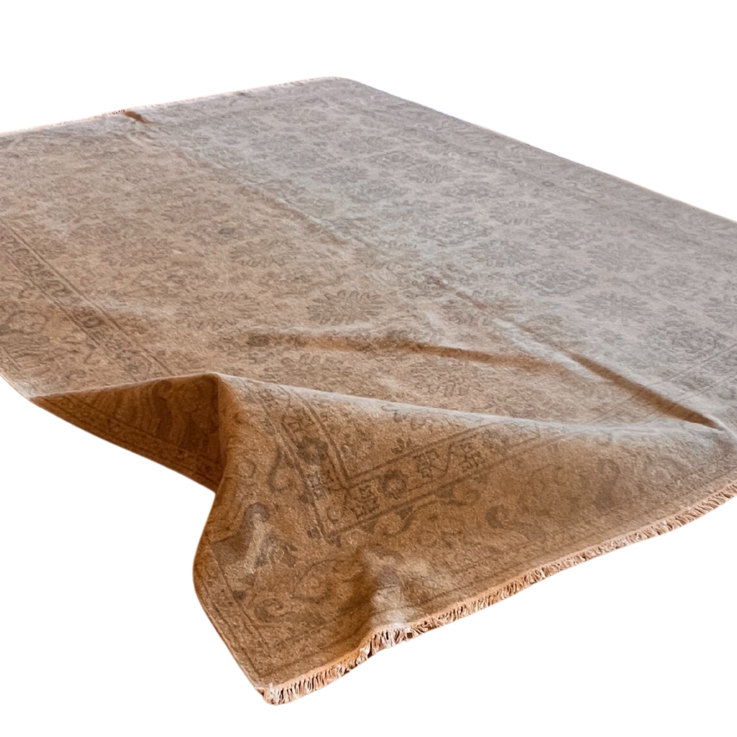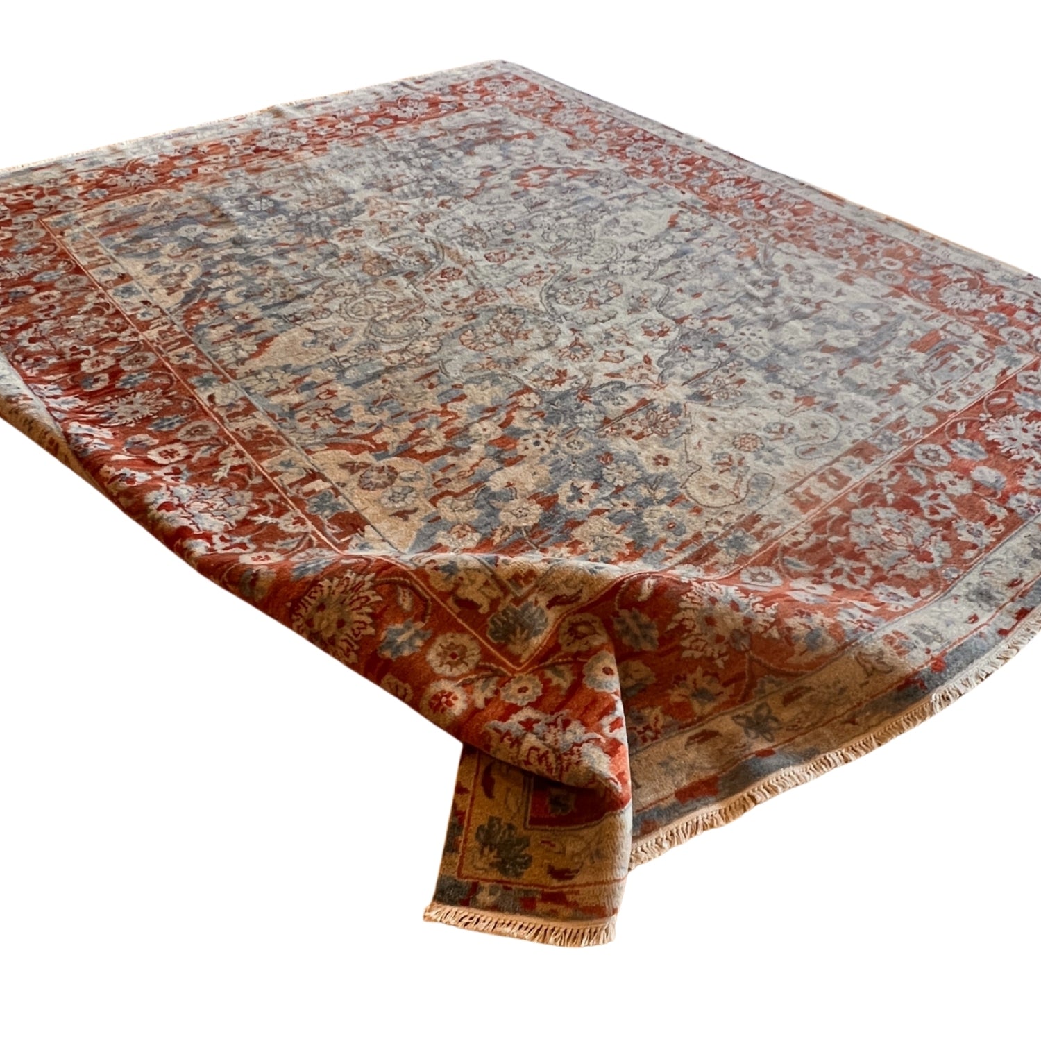 Hand-knotted in India Expertly hand-knotted by artisans in India, crafted from durable, plush wool with a vintage texture in soft weathered colors and finished with a classic fringe. Available in up to seven sizes: 12'0 x 15'0, 10'0 x 14'0, 11'0 x 11'0, 9'0 x 12'6, 7'9 x 9'9, 5'0 x 7'0, 2'10" x 12'0."