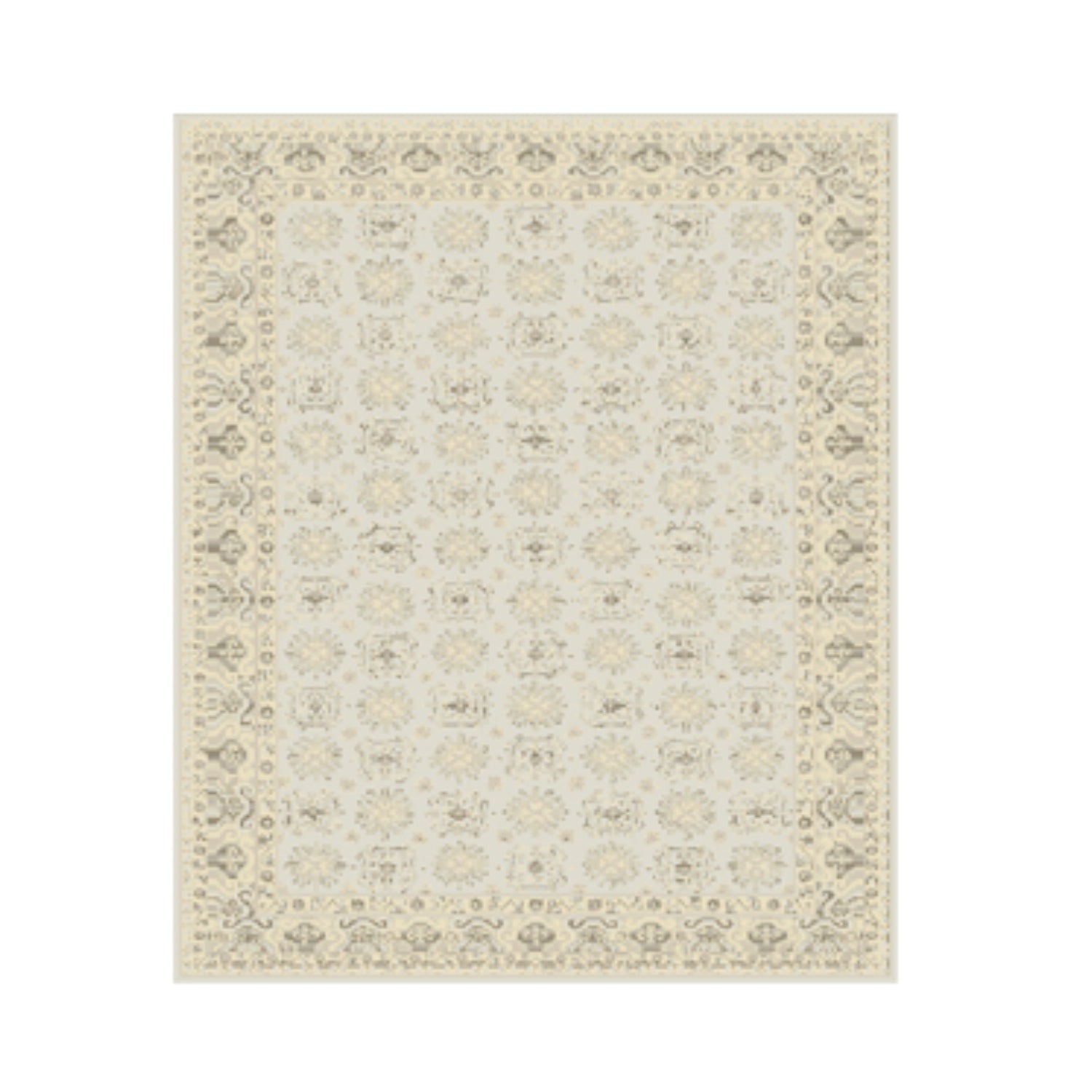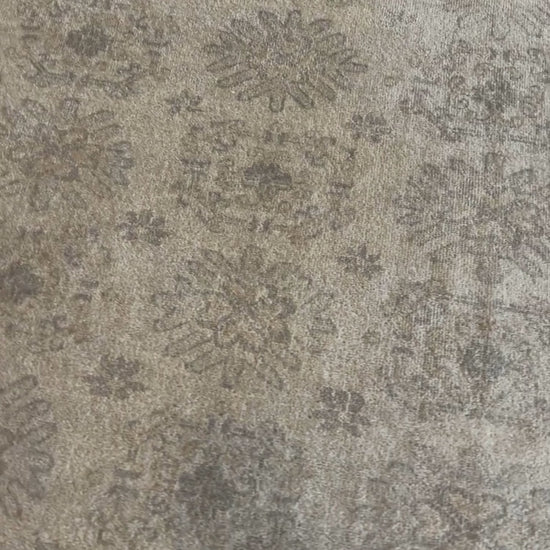 The Vedi brings a popular East Turkestan design to life, framed by a unique Chinese-influenced border in soft gold and grey. This hand-knotted wool rug from our Noblesse Collection features a vintage texture and classic fringe. Its weathered colors and intricate cultural patterns add a refined, global character to any setting.