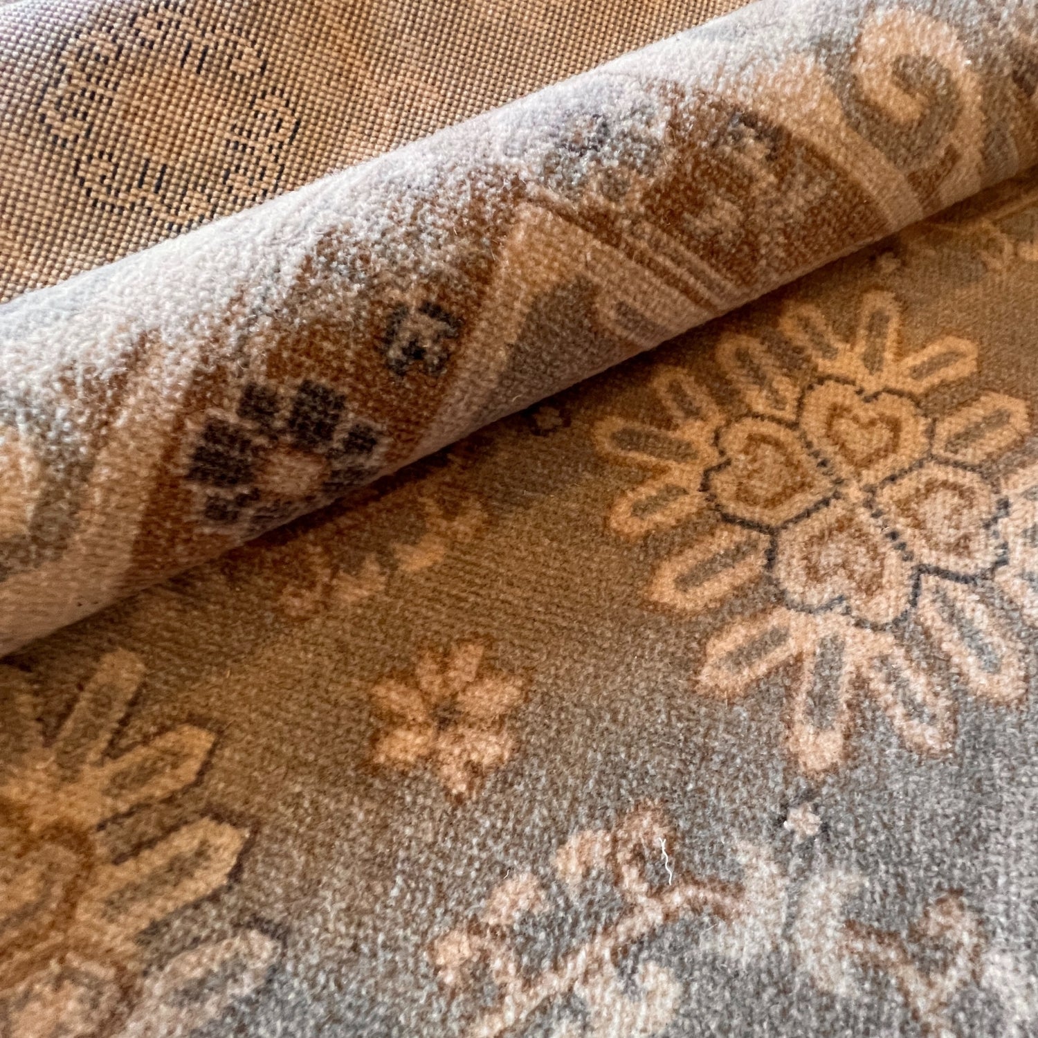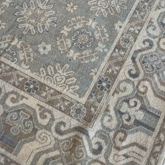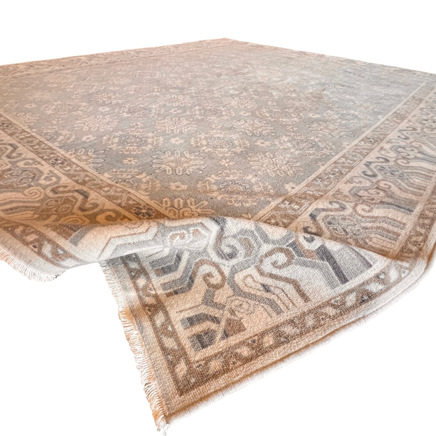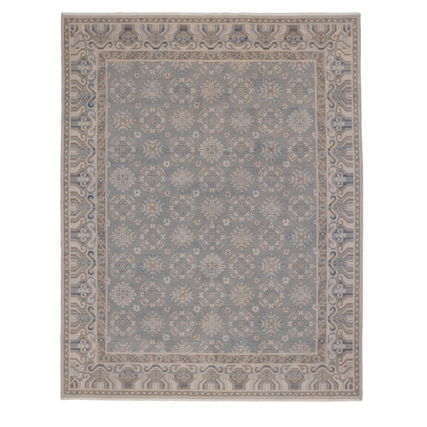 Discover the Wando, a hand-loomed wool beauty from our Riverie Collection. The delicate field design and dramatic border are balanced in shades of gray and blue. It is finished with a luster wash and authentic fringe to provide the sophisticated charm of a vintage treasure.